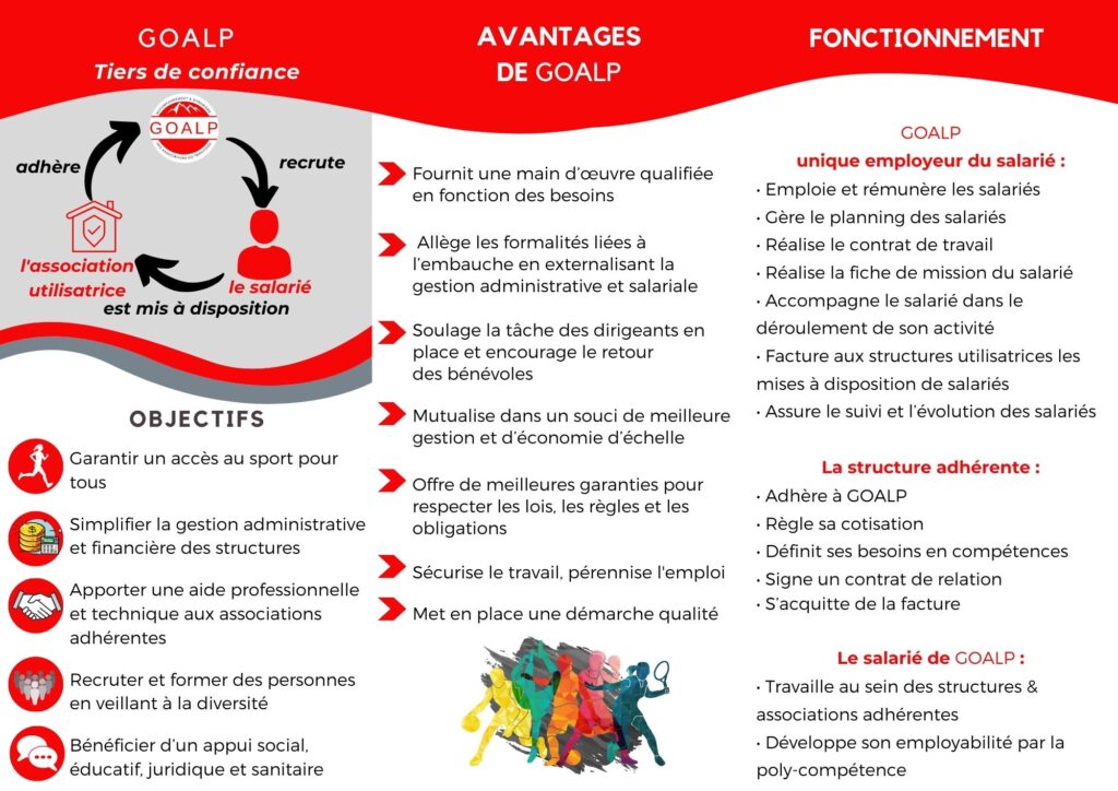 GOALP est un groupement d’employeurs qui a pour objet la mise à disposition de ses membres d’un ou plusieurs salariés ainsi que l’aide et le conseil en matière d’emploi et de gestion des ressources humaines dans le domaine du sport.